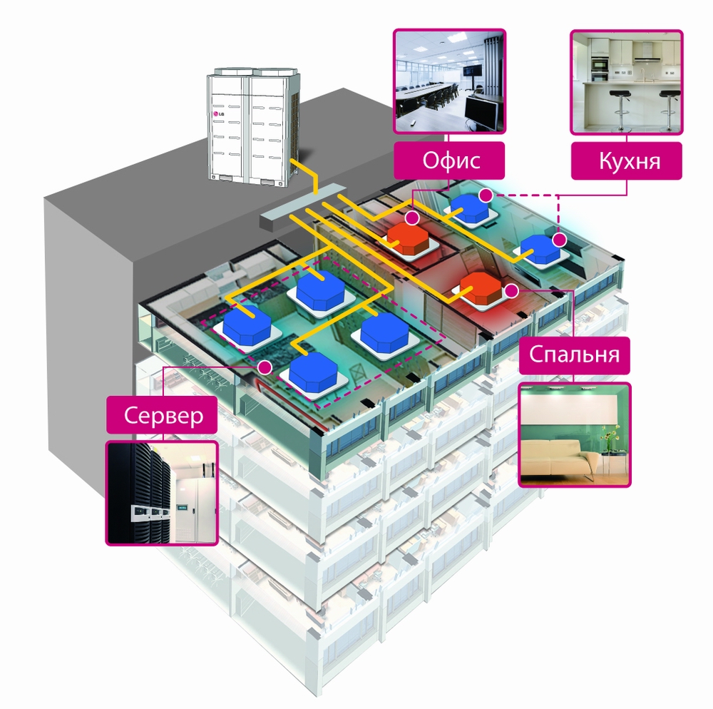Поскольку на нужды горячего водоснабжения, отопления, вентиляции и кондиционирования воздуха расходуется более 50% электроэнергии всего здания, оптимальный выбор климатических и инженерных систем позволит сэкономить значительную часть эксплуатационных расходов. Одним из главных преимуществ компании LG является комплексный подход к вопросу энергосбережения и энергоэффективности здания в целом.