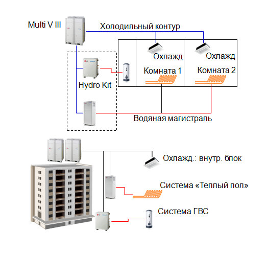 Multi V III способна также решать ряд дополнительных задач, таких как отопление, горячее водоснабжение и управление центральным кондиционером с фреоновым испарителем. Модуль для отопления и ГВС Hyrdo Kit, который был представлен в этом году на выставке Mostra Convengo Expocomfort (MCE)-2012 и получивший награду в номинации Percorso Efficienza и Innovazione (путь эффективности и инноваций), способен управлять горячим водоснабжением и «теплыми полами» эффективнее, чем обычный котел, экономя при этом до 77% электроэнергии. Hydro Kit эффективно работает при температуре наружного воздуха до −20°C. Использование системы кондиционирования Multi V III и модуля Hydro Kit является отличным решением для зданий малой и средней этажности, где необходимо не только эффективное охлаждение воздуха, но и подача нагретой воды для нужд ГВС и отопления. Модуль изготавливается в двух модификациях — низкотемпературный с нагревом воды до 50°C и высокотемпературный с нагревом воды до 80°C, что отвечает санитарно-гигиеническим требованиям СНиП