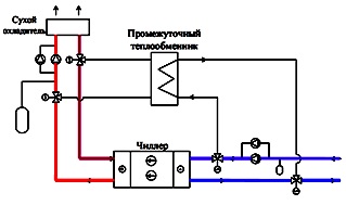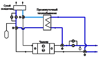 Схема 2. Чиллер внутреннего размещения, сухой охладитель и промежуточный теплообменник (два режима работы).