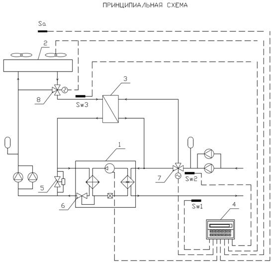 Sw1 – датчик температуры охлаждаемой воды Sw2 – датчик температуры обратной воды Sw3 – датчик температуры гликолевого раствора на входе в промежуточный теплообменник Sa – датчик температуры наружного воздуха |