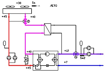При температуре окружающего воздуха (по датчику Sa) выше температуры обратной воды (по датчику Sw2), вода через трехходовой клапан поступает напрямую в испаритель чиллера, где охлаждается до заданной температуры, а далее направляется к потребителям холода.