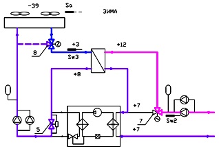Если температура уличного воздуха (по датчику Sa) опускается ниже температуры обратной воды (по датчику Sw2), поток этой жидкости через трехходовой клапан (7) поступает в промежуточный теплообменник, где охлаждается гликолевым раствором. При этом температура воды не достигает заданного значения. Далее вода направляется в испаритель чиллера, где охлаждается до заданного значения температуры. Холодильная установка в этом случае работает не на полную мощность, которая будет снижаться по мере понижения температуры уличного воздуха до момента полного перехода на свободное охлаждение.
