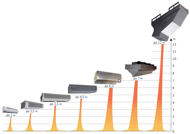 Тепловые завесы серии «А» – компактные, легкие и не шумные завесы. Серия «М» – небольшие завесы для помещений с высокими требованиями к дизайну. Серия «Т» – средние завесы с мощность до 12 кВт. Серии «D», «X400E», «X500E» – крупные промышленные завесы мощностью до 30 кВт для проемов высотой до 8 м.
