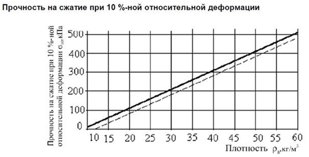 Прочность на сжатие при 10 %-ной линейной деформации, кПа, имеет прямую зависимость от плотности, чем выше плотность тем выше прочность на сжатие.