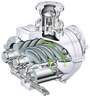 Винтовой компрессор представляет собой ротационный агрегат, работающий по принципу объемного сжатия. Важнейшая деталь винтового компрессора — винтовой блок. Сжатие воздуха происходит за счет сокращению пространства между лопастями роторов и стенкой корпуса винтового блока. Устройство работает на дизельном, бензиновом или электрическом приводе.