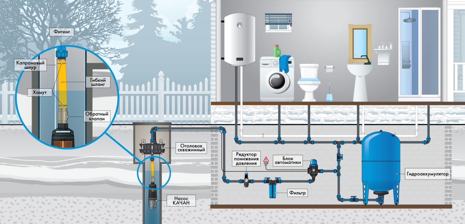 Если отбросить вариант с централизованным водоснабжением, то для ХВС в частном доме придется обустроить достаточно сложную систему. Она состоит из нескольких компонентов: