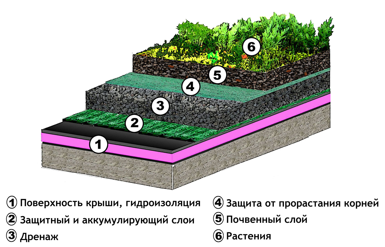 «Зеленая» крыша многоэтажного здания устроена просто: сверху на корнезащитный слой и дренаж укладывается мембранный слой и почва (субстрат) глубиной от 20 см до 1 м, на которую, в свою очередь, высаживаются растения. Даже если кровля не приспособлена для зеленых посадок, можно обойтись контейнерами с растениями. Технологий озеленения сооружений придумано множество, но традиционный «пирог» мало подвержен принципиальным изменениям.