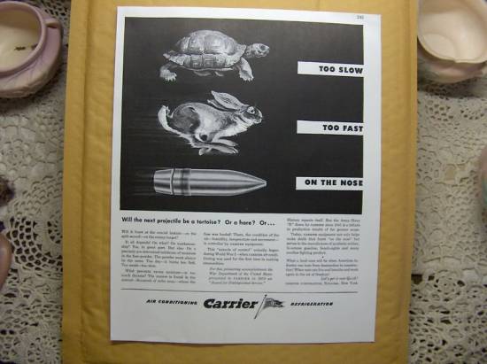 Нашла еще более старый рекламный макет, времен 2 Мировой, 1943 год. Вот там воспевается не комфорт, а "боевые" св-ва кондиционера. А именно - способность точно поддерживать влажность, оптимальную для пороха. Т.е. "кондиционер позволяет нашим снарядам поражать противника точно в цель":